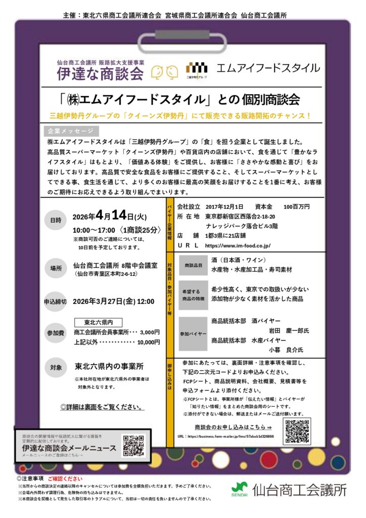㈱エムアイフードスタイルとの個別商談会が令和8年4月14日(火)に開催されます。